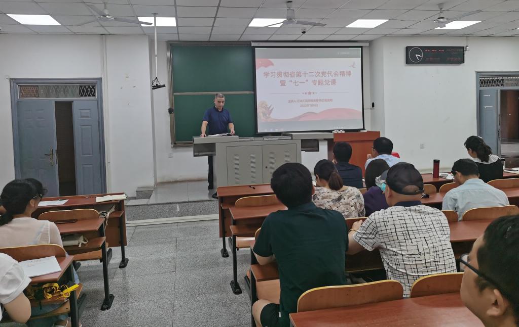 (通讯员 周晓峰)为深化学习省第十二次党代会精神,进一步统一思想、凝聚共识、明确方向,7月6日下午2时,公司在武教B103开展学习贯彻省第十二次党代会精神暨“七一”专题党课。党委书记张光明主讲,全体党员教职工参加。
