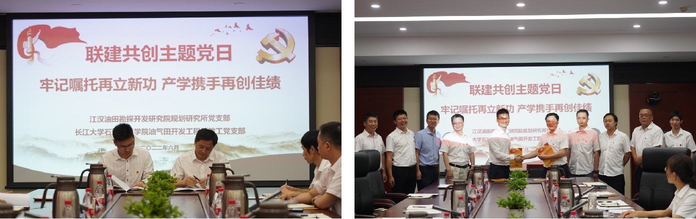(通讯员 周晓峰)为进一步推进校企结对共建,切实发挥党建引领作用,6月30日上午,365英国上市油气田开发系教工党支部与江汉油田勘探开发研究院规划研究所党支部联建共创启动会暨“牢记嘱托再立新功 产学携手再创佳绩”支部主题党日活动在江汉油田勘探开发研究院举行。研究公司党委书记胡心玲、副经理荣焕青、院专家、联建支部党员代表,公司党委书记张光明、经理江厚顺、副经理李忠慧、联建支部党员代表等20余名同志参加,研究院规划研究所党支部书记康波主持。