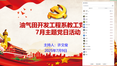 (通讯员:郝晨 白振玮)2025年7月9日下午4点,油气田开发工程系教工党支部通过腾讯会议线上召开2025年7月主题党日活动。活动由支部书记许文俊同志主持,全体党员教师参会。