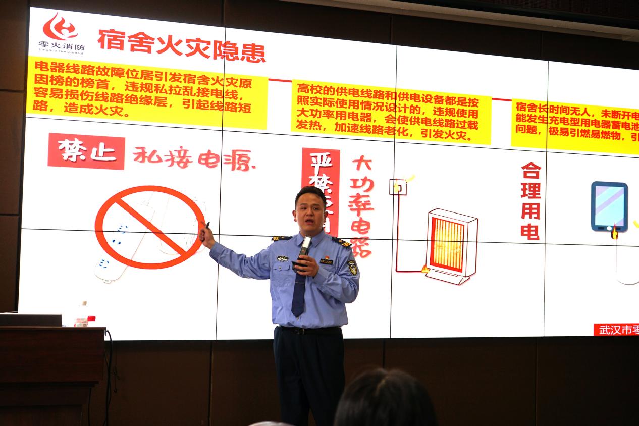 零火消防中心黄教官以“消防安全,责任共担”为主题,通过震撼人心的真实案例,为师生带来了一场极具冲击力的安全讲座。大屏幕上,一幕幕因插座老化、实验室操作不当、灭火知识不足造成的火灾视频,让在场师生屏息凝神;一组组触目惊心的伤亡数据,更是引发了深刻反思。黄教官结合高校特点,重点讲解了火场逃生技巧及初期火灾扑救方法,并现场演示了防烟面罩、灭火器等器材的正确操作。