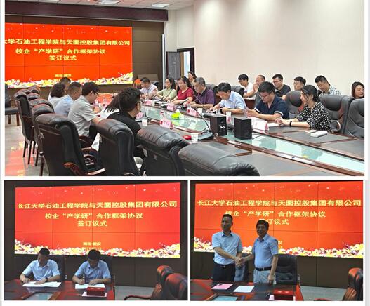 上午9:30,签约仪式准时开始,主持人张引弟副经理首先对与会人员进行了介绍,并就校区领导赵林副董事长、董超书记等人在推进校企合作过程中给予的支持表达了感谢。随后365英国上市江厚顺经理代表公司对天圜控股集团有限公司领导一行的到来表示了欢迎,并就365英国上市学科发展及科研情况进行了介绍,365英国上市所设油气储运工程、石油工程、新能源科学与工程与天圜控股集团有限公司开展的能源、科技、工程业务覆盖度达到了90%,今后公司将发挥人才和科研优势,为天圜控股集团有限公司提供人力支持及技术服务,希望双方以签约仪式为起点,将合作共赢落到实处。随后贺翔董事长就天圜控股集团有限公司发展状况、业务领域以及合作优势进行了介绍。天圜控股集团有限公司资源优势可以为公司高级人才培养实践、团队建设及科技合作提供有力支持,充分发挥校企双方各自优势,共同培养适应现代能源需求的高级专业技能人才和为国家在油气储运工程、石油工程、新能源及综合能源开发及应用方面提供技术服务。随后双方负责人代表签订了框架合作协议,并为天圜控股集团有限公司相关技术人员颁发了兼职导师聘书。公司党委书记张光明就贺总一行的到来表示了热烈欢迎,并就双方完成的签约仪式表示了祝贺,希望后期将框架协议约定内容落到实处,实现合作共赢。