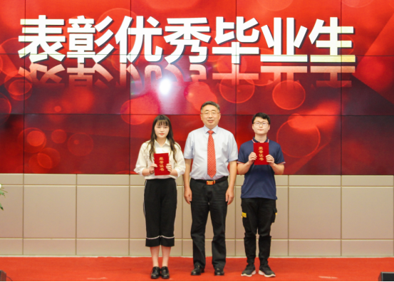 公司副经理张引弟宣读优秀毕业生表彰文件,校党委副书记蒋光忠为优秀毕业生代表颁发荣誉证书。