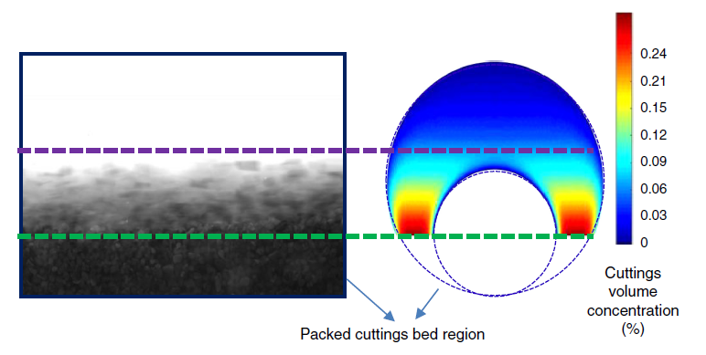 在上述模型基础上,针对复杂工况条件下的井眼清洁分析,智能钻井技术项目组开发出基于计算流体力学方法的动态井眼清洁模型,2020年在《SPE Journal》上发表 “Modeling of Dynamic Cuttings Transportation during Drilling of Oil and Gas Wells by Combining 2D CFD and 1D Discretization Approach”。该论文结合2D CFD和1D岩屑运移连续模型,利用2D CFD模拟井筒界面内的流动和悬浮岩屑分布,1D连续模型模拟岩屑在井筒轴向的移动,提出一种新的动态岩屑运移模型,模型计算结果与实验数据吻合较好。该方法克服传统模型在高流速条件下预测床高不足的缺点,能够用于局部复杂井眼的岩屑运移分析。