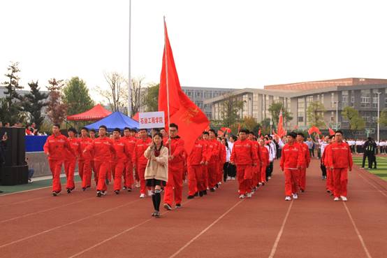 运动会开幕式于上午8时隆重举行,身着鲜艳红色油工服的51名油工学子和公司领导班子成员、教职工代表全院师生迈着铿锵有力的步伐,通过主席台接受检阅。在各公司方队的精彩表演和运动会代表的庄严宣誓后,运动会各项比赛随即展开。