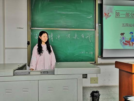 班会在副团支书皮莎同学的讲话中开始,她简述了班会目的,明确了班会学习重点,简单地介绍了五四运动,让同学们对“五四”有了一定的了解。