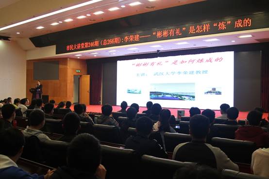 周六清晨,同学们早早便集合完毕,乘坐大巴来到了武汉市民之家。在简单的互动后,李荣建教授登台演讲。演讲中,李教授跟同学们分享了他的人生经历,讲述了他的学习和成长过程,并就学习方面向我们的同学传授了一些小技巧。