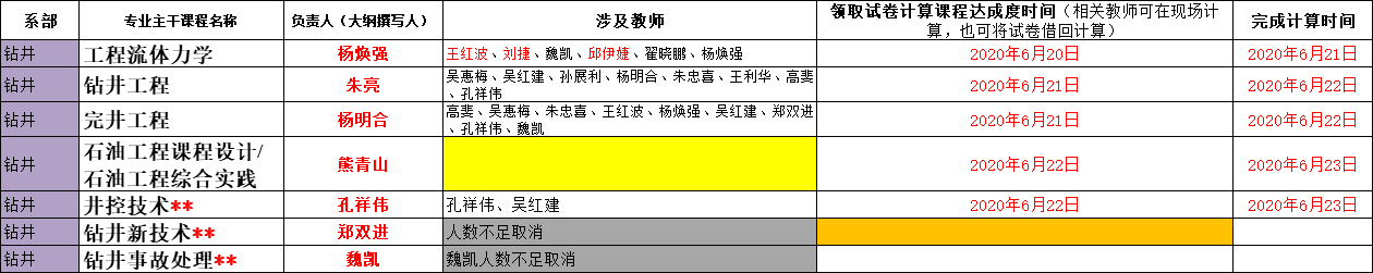 根据2020年6月16日专业认证推进会会议决定,公司石油工程专业19门课程的达成度计算由相关课程任课教师负责,各系主任(钻井系熊青山教授、开发系张顶学教授、油化系付美龙教授)负责落实安排具体完成教师,完成达成度计算的截止时间为6月24日。相关课程、课程大纲撰写人、授课教师名单、领取试卷时间安排等见附件。