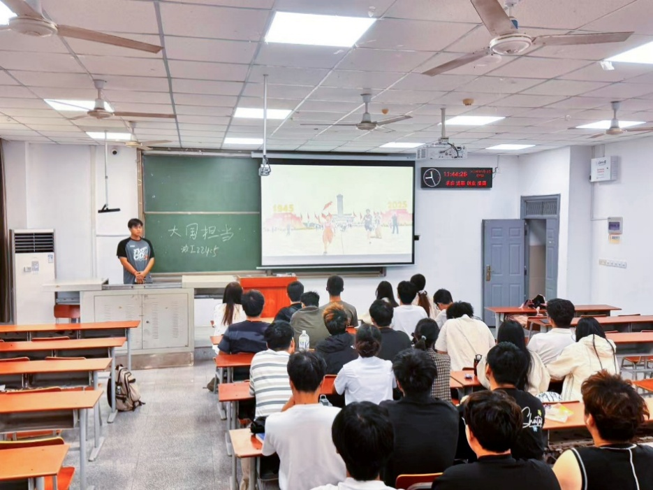油工22401班长李嘉翔:80年前,先辈们用鲜血和生命换来了民族独立与解放;80年后的今天,时代把“建设强国、守护和平”的接力棒交到了我们手中。这堂思政大课让我明白,伟大抗战精神从未过时,它在当代中国的大国担当里得到了新的诠释,更需要我们青年一代去传承、去践行。未来的日子里,我愿以抗战先辈为榜样,以“功成不必在我,功成必定有我”的信念,把个人理想融入国家发展大局,用青春的汗水与奋斗,书写属于我们这一代人的“大国担当”答卷,做光荣自豪的中国人,更做无愧于时代的中国青年!
