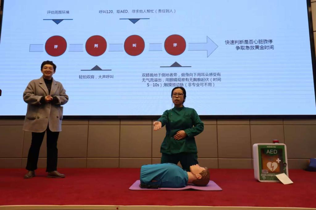 学习急救知识,守护生命健康。协和江北医院护士长胡芳以一系列触目惊心的数据,深刻揭示了我国心脏骤停院外急救成功率极低的现状,引发了全场师生的深思。她通过理论讲解、视频演示与情景模拟相结合的方式,生动传授了心肺复苏(CPR)与自动体外除颤仪(AED)的核心急救技能,鼓励大家在紧急情况下勇敢伸出援手。