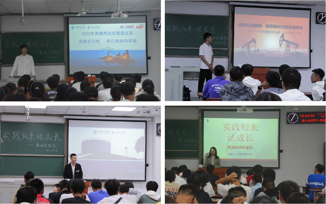 冀国华、郭凌微等8名实践队员讲述了他们在实践活动中的见闻,也分享了实践过程中的感悟。冀国华同学以“深海在召唤,来自南海的答案”为主题,讲述了当下中国石油的科技力量和祖国石油行业的欣欣向荣;张凯伦以“肩负重任,勇敢前行!我用石油梦贡献中国梦!”为主题,展现了石油人“清澈的爱只为祖国”的壮志豪情;许尧朴同学用自己的亲身经历讲述了一个农村娃的“石油梦”,一个长大学子用石油改变人生、为祖国贡献力量的故事。“正是因为有着一代又一代石油人的接续奋斗,才有如今我国能源事业的蓬勃发展!”张硕同学感慨道。实践队员用自己的亲身经历诉说着石油人和石油魂,让同学们在潜移默化中感受石油精神的内涵,他们既是石油故事的讲述者,更是石油精神的传递者。