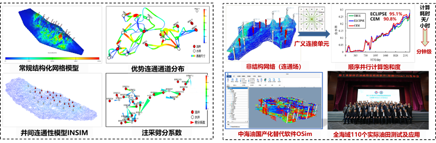 首创了非结构网络体系的油藏模拟广义连接元法,开发了数据物理双驱井间连通性模型INSIM,耦合图神经网络与路劲追踪算法快速实现连通场反演和动态预测,解决了传统流线法难以表征井间优势路径形态、分布和劈分等难题。研发了智能注采一体化及软硬件系统平台,被集成到中海油首款海上数值模拟软件—海潮OSim、全球最大开源数值模拟软件MRST及雪佛龙、壳牌等公司模拟器,相比传统数模满足工程误差下提速1~2个数量级。
